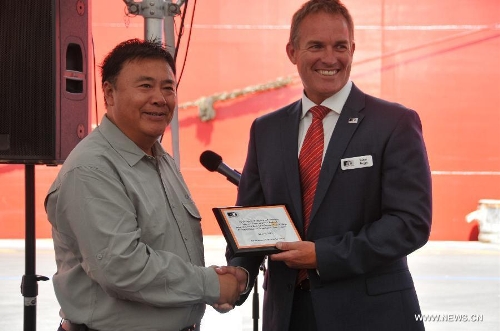 Chief Executive of Antarctica New Zealand Peter Beggs (R) presents gifts to the Chinese icebreaker Xue Long in Christchurch, New Zealand, Jan. 17, 2015. Chinese icebreaker and polar research vessel Xue Long arrived at Lyttelton Port in Christchurch on Friday. The Christchurch City Council and Antarctica New Zealand welcomed the vessel in Maori style. (Xinhua/Su Liang)