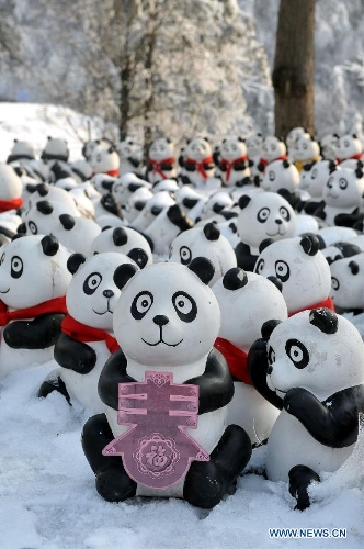 Photo taken on February 4, 2015 shows the panda sculptures at Daming Mountain Park in Lin'an City, east China's Zhejiang Province. The park created 2015 panda and penguin sculptures to attract tourists. Photo: Xinhua