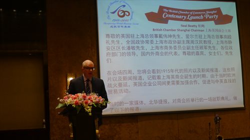 The launch party marked the beginning of the centennial celebration for the chamber, which was founded in 1915. The hall was decorated with photographs and newspaper clippings about the establishment of the chamber 100 years ago, a time when Europe was embroiled in World War I. At that time, British merchants in Shanghai gathered to discuss how to protect British business interests, which largely accelerated the formation of the chamber.