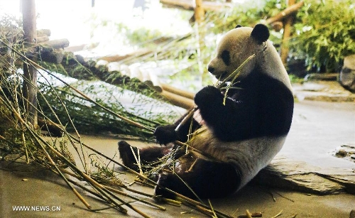 Giant panda Xing Hui eats bamboo at the Pairi Daiza Zoo in Brugelette, Belgium, on April 4, 2015. A pair of giant pandas from China, Xing Hui, the male, and Hao Hao, the female, was available to visitors again after the zoo reopened to public after the winter. The pandas from Sichuan Province of China arrived here in February 2014 and will stay for 15 years. Photo: Xinhua