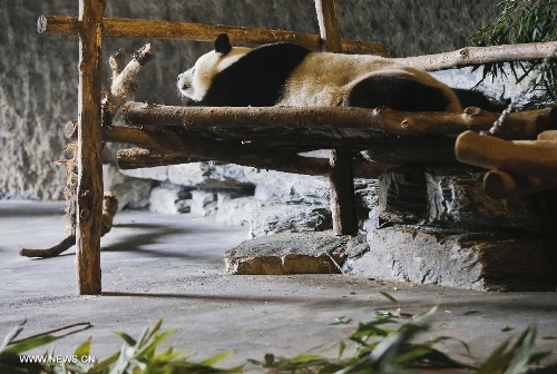 Giant panda Hao Hao sleeps at the Pairi Daiza Zoo in Brugelette, Belgium, on April 4, 2015. A pair of giant pandas from China, Xing Hui, the male, and Hao Hao, the female, was available to visitors again after the zoo reopened to public after the winter. The pandas from Sichuan Province of China arrived here in February 2014 and will stay for 15 years. Photo: Xinhua