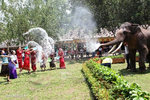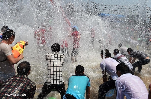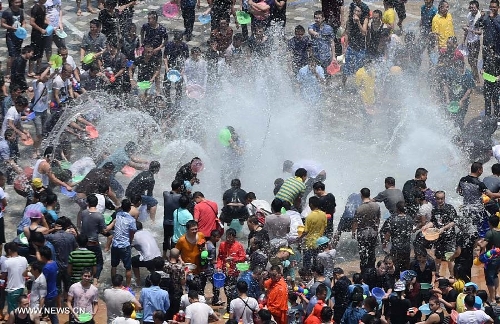 People celebrate the Water-Sprinkling Festival in Dai Autonomous Prefecture of Xishuangbanna, southwest China's Yunnan Province, April 15, 2015. The water-sprinkling festival, which is also the New Year festival of the Dai people, is a traditional folk activity celebrated by people of Dai ethnic group in China and also by people in Thailand, Cambodia, Myanmar etc.. People sprinkle water to each other to pray for good fortune and safety during the festival. Photo: Xinhua