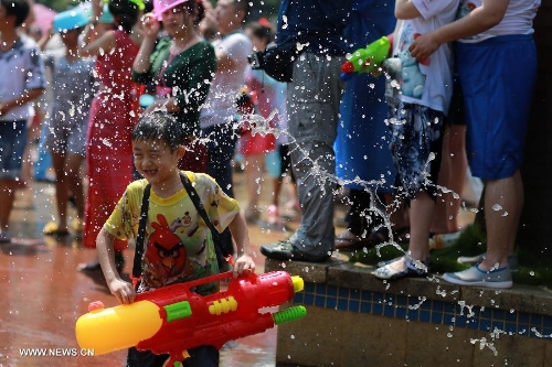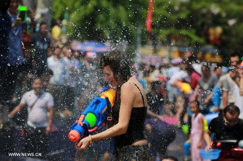 Students celebrate the Water-Sprinkling Festival at Liuzhou Teachers College in Liuzhou, southwest China's Guangxi Zhuang Autonomous Region, April 14, 2015. The water-sprinkling festival, which is also the New Year festival of the Dai people, is a traditional folk activity celebrated by people of Dai ethnic group in China and also by people in Thailand, Cambodia, Myanmar etc.. People sprinkle water to each other to pray for good fortune and safety during the festival. Photo: Xinhua