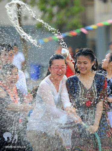 Students from Laos celebrate the Water-Sprinkling Festival at Sichuan University of Arts and Science in Dazhou, southwest China's Sichuan Province, April 15, 2015. The water-sprinkling festival, which is also the New Year festival of the Dai people, is a traditional folk activity celebrated by people of Dai ethnic group in China and also by people in Thailand, Cambodia, Myanmar etc.. People sprinkle water to each other to pray for good fortune and safety during the festival. Photo: Xinhua