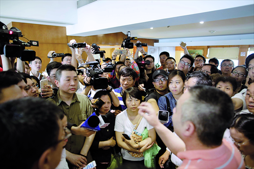 A Zhabei district official (bottom right) at the headquarters of Xiehe Travel Agency Tuesday addresses anxious families of local tourists who were aboard a capsized passenger ship. Out of 458 passengers, 97 travelers, many elderly, were from Shanghai. The ship sank after getting caught in a cyclone Monday night in the Hubei section of the Yangtze River. Fifteen people have been rescued from the sunken ship as of Tuesday afternoon. Photo: Yang Hui/GT