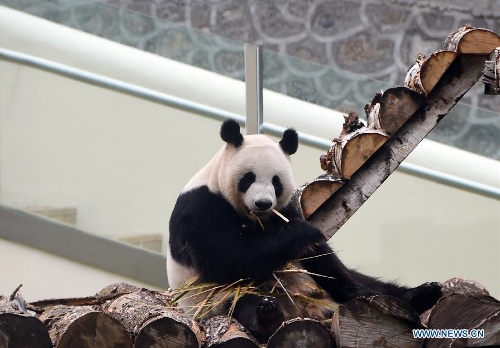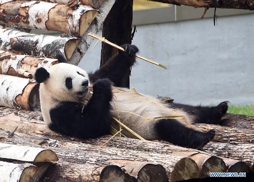 A giant panda eats bamboo in the panda house of the Siberian Tiger Park of Jilin Province in Changchun City, capital of northeast China's Jilin Province, July 1, 2015. A pair of giant pandas from the China Conservation and Research Center for the Giant Panda saw public in the Siberian Tiger Park of Jilin Province on Wednesday. The pandas, one male and one female, eight years old and seven years old respectively, will be raised here for three years. Photo: Xinhua