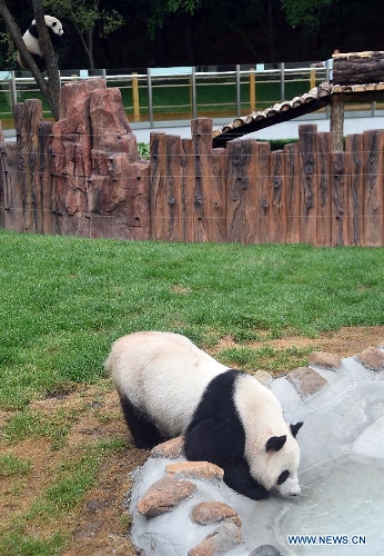 A giant panda walks in the panda house of the Siberian Tiger Park of Jilin Province in Changchun City, capital of northeast China's Jilin Province, July 1, 2015. A pair of giant pandas from the China Conservation and Research Center for the Giant Panda saw public in the Siberian Tiger Park of Jilin Province on Wednesday. The pandas, one male and one female, eight years old and seven years old respectively, will be raised here for three years. Photo: Xinhua