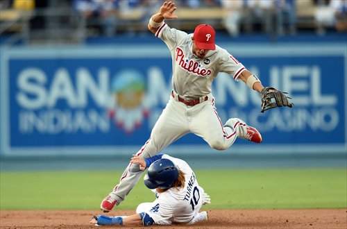 Philadelphia Phillies infield Cesar Hernandez leaps over Los Angeles Dodgers infield Justin Turner after attempting to force him out at second base during a Major League Baseball game at Dodger Stadium in Los Angeles on Tuesday. The Dodgers won 5-0. Photo: IC