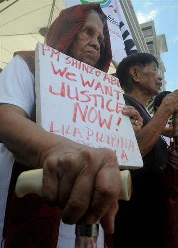 An elderly Filipino woman, holding her cane and a placard, attends a protest during a rally by former sex slaves of the Japanese Imperial Army in front of the Japanese Embassy in Manila on Friday. Filipino "comfort women" call for an official apology from the Japanese government and just compensation as the world commemorate the 70th anniversary of the end of WWII on Saturday. Photo: AFP