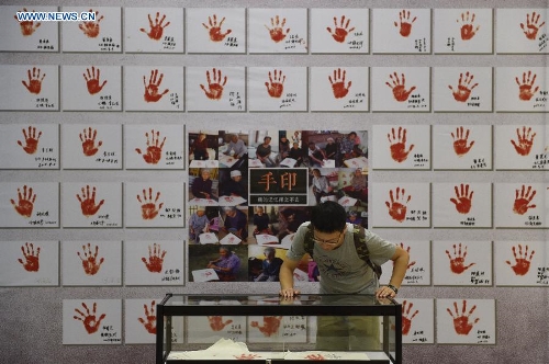 Visitors view handprints of comfort women survivors in an exhibition of photos and real objects at the Hangzhou Library in Hangzhou, capital of east China's Zhejiang Province, Aug. 18, 2015. An exhibition to mark the 70th anniversary of victory in the Chinese People's War of Resistance Against Japanese Aggression kicked off here on Tuesday, displaying 70 international comfort women survivors' portraits, daily objects and handprints. (Xinhua/Ju Huanzong)