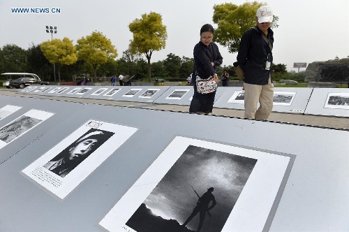 People look at file pictures at Lugou Bridge where Japan launched the all-out war of aggression against China, in Beijing, Capital of China, Aug. 29, 2015. China will stage a military parade on Sept. 3 to commemorate the 70th anniversary of the victory of the Chinese People's War of Resistance Against Japanese Aggression and the World Anti-Fascist War. (Xinhua/Peng Zhaozhi)
