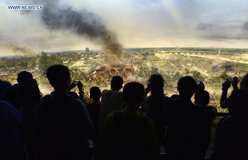 People watch a simulated scene of the Japanese invasion of Wanping town, east of Lugou Bridge, at the Museum of the War of Chinese People's Resistance against Japanese Aggression in Beijing, Capital of China, Aug. 29, 2015. China will stage a military parade on Sept. 3 to commemorate the 70th anniversary of the victory of the Chinese People's War of Resistance Against Japanese Aggression and the World Anti-Fascist War. (Xinhua/Peng Zhaozhi)