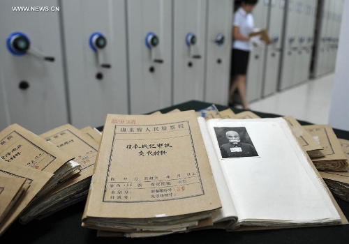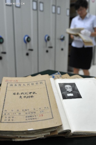 Photo taken on Aug. 15, 2014 shows the original document of Japanese war criminals in Jinan, capital of east China's Shandong Province. The Shandong Provincial Archives would reveal archives of ten Japanese war criminals since Aug. 15. (Xinhua/Xu Suhui)