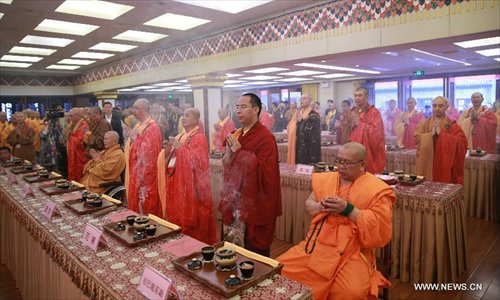 Buddhists hold the praying ceremony at Longquan temple in Beijing, capital of China, September 4, 2015. Religious circles in China on Friday held praying and various activities to commemorate the 70th anniversary of the victory of the Chinese People's War of Resistance Against Japanese Aggression and the World Anti-Fascist War. Photo:Xinhua