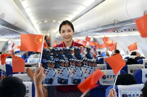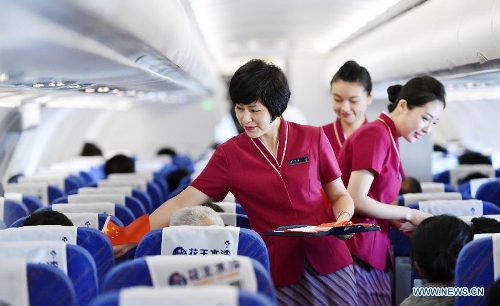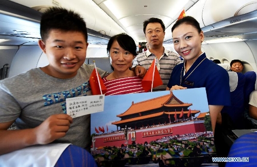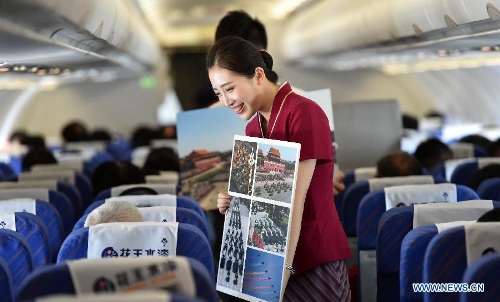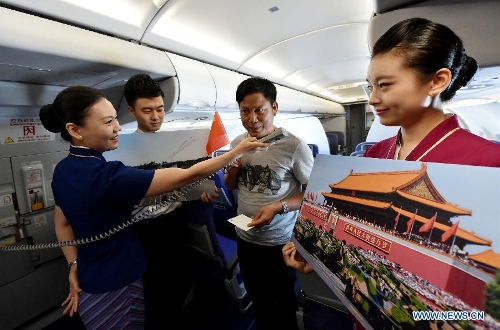 Flight attendants send national flags to passengers on flight CZ6366 from Beijing, capital of China, to Haikou, capital of south China's Hainan Province, Sept. 5, 2015. China Southern Airlines started an event called "In Commemoration of Beijing V-day parade" on a Beijing-Haikou flight Saturday, showing the parade photos for passengers. China on Thursday held commemoration activities, including a grand military parade, to mark the 70th anniversary of the victory of the Chinese People's War of Resistance against Japanese Aggression and the World Anti-Fascist War. (Xinhua/Zhao Yingquan)