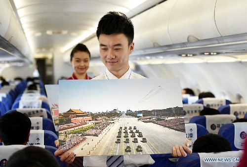A flight attendant shows photos of Beijing V-day parade on flight CZ6366 from Beijing, capital of China, to Haikou, capital of south China's Hainan Province, Sept. 5, 2015. China Southern Airlines started an event called "In Commemoration of Beijing V-day parade" on a Beijing-Haikou flight Saturday, showing the parade photos for passengers. China on Thursday held commemoration activities, including a grand military parade, to mark the 70th anniversary of the victory of the Chinese People's War of Resistance against ese Aggression and the World Anti-Fascist War. (Xinhua/Zhao Yingquan)