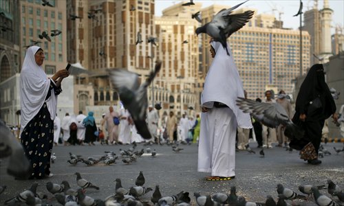 Muslim pilgrims take pictures while standing amongst pigeons outside the Grand Mosque in Mecca ahead of the annual hajj pilgrimage on Monday. Photo: CFP