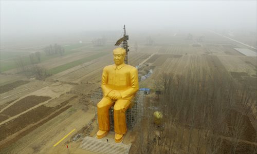 A giant golden statue of late Chinese leader Mao Zedong is under construction in a field in Zhushigang village, Tongxu county, Central China's Henan Province, on January 4. Local authorities told the People’s Daily on Friday that the statue has been removed, because the construction was not approved by the local government. Photo: hnr.cn