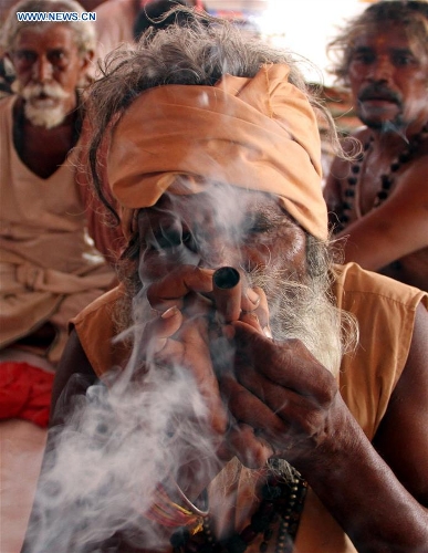 A sadhu smokes cannabis while waiting for registering of the coming annual Amarnath Yatra at a base camp near Amarnath cave in Jammu, Indian-controlled Kashmir, June 27, 2016. Thousands of Hindu devotees will join the yearly pilgrimage that starts on July 2 this year, to see an ice stalagmite formed inside the cave. (Xinhua/Stringer)