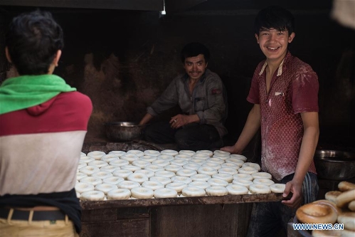 Bakers make nang, a kind of crusty pancake, staple food of the Kashgar people, in Kashgar, northwest China's Xinjiang Uygur Autonomous Region, July 2, 2016. Bakers spent over 16 hours making around four or five thousand nangs to meet the needs as the breaking fast is approaching. (Xinhua/Bu Duomen)
