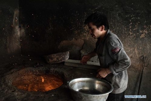 A baker put some firewood into a brick oven to bake nang, a kind of crusty pancake, staple food of the Kashgar people, in Kashgar, northwest China's Xinjiang Uygur Autonomous Region, July 2, 2016. Bakers spent over 16 hours making around four or five thousand nangs to meet the needs as the breaking fast is approaching. (Xinhua/Bu Duomen)