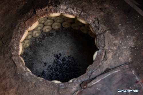 A man takes baked nang, a kind of crusty pancake, staple food of the Kashgar people, out of a heated brick oven in Kashgar, northwest China's Xinjiang Uygur Autonomous Region, June 28, 2016. Bakers spent over 16 hours making around four or five thousand nangs to meet the needs as the breaking fast is approaching. (Xinhua/Bu Duomen)