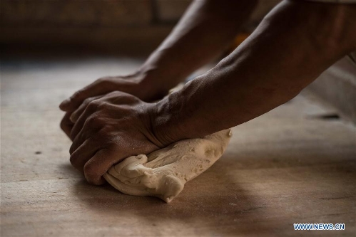 A man rolls the dough before making nang, a kind of crusty pancake, staple food of the Kashgar people, in Kashgar, northwest China's Xinjiang Uygur Autonomous Region, July 2, 2016. Bakers spent over 16 hours making around four or five thousand nangs to meet the needs as the breaking fast is approaching. (Xinhua/Bu Duomen)