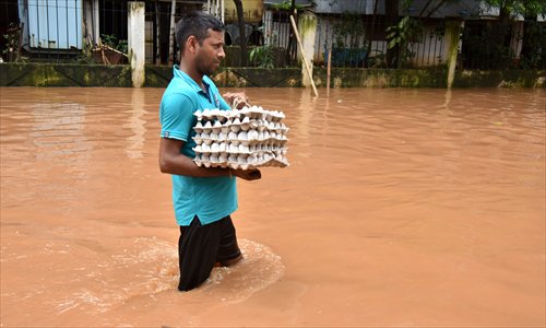 An Indian resident carries a tray of eggs as he wades through floodwaters in the Anilnagar area of Guwahati on Tuesday. Floods in the northern Indian state of Assam have affected people living across six districts as the annual monsoon continues to cross the Indian sub-continent. The states of Uttarakhand and Uttar Pradesh reported five fresh rain-related deaths on Monday. Photo: AFP