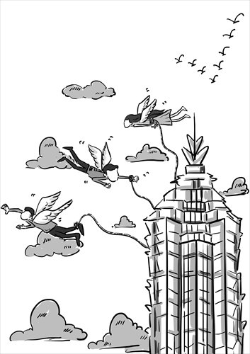 The highest glass skywalk without a guardrail opened last Thursday outside the 88th floor of Jin Mao Tower. With a harness, visitors can look down on the city from the 1.2-meter-wide skywalk 340 meters aboveground. Illustration: Chen Xia/GT