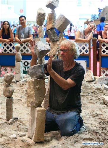 Visitors watch a rock balancing performance at the 2016 Canadian National Exhibition in Toronto, Canada, Aug. 19, 2016. As one of the biggest exhibitions in Canada, this annual 18-day event which kicked off on Friday is expected to draw more than one million visitors from around the world. (Xinhua/Zou Zheng)