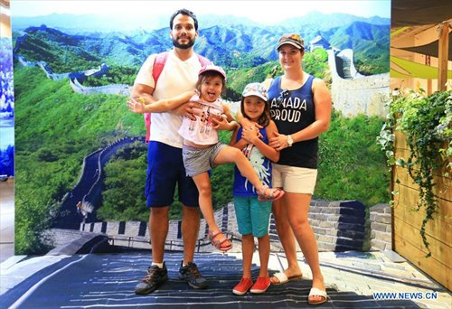 A family poses for photos in front of a poster of the Great Wall provided by China National Tourist office at the 2016 Canadian National Exhibition in Toronto, Canada, Aug. 19, 2016. As one of the biggest exhibitions in Canada, this annual 18-day event which kicked off on Friday is expected to draw more than one million visitors from around the world. (Xinhua/Zou Zheng)