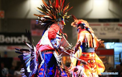 Aboriginal dancers perform at the 2016 Canadian National Exhibition in Toronto, Canada, Aug. 19, 2016. As one of the biggest exhibitions in Canada, this annual 18-day event which kicked off on Friday is expected to draw more than one million visitors from around the world. (Xinhua/Zou Zheng)