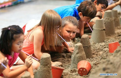 Kids take part in sand sculpting workshop at the 2016 Canadian National Exhibition in Toronto, Canada, Aug. 19, 2016. As one of the biggest exhibitions in Canada, this annual 18-day event which kicked off on Friday is expected to draw more than one million visitors from around the world. (Xinhua/Zou Zheng)