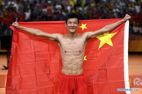 Chen Long of China celebrates his victory over Lee Chong Wei of Malaysia during the men's singles final of badminton competition at the 2016 Rio Olympic Games in Rio de Janeiro, Brazil, on Aug. 20, 2016. Chen took the title of the event after beating Lee 2-1. (Xinhua/Wang Peng)
