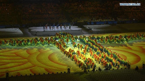 Artists perform during the closing ceremony of the 2016 Rio Olympic Games at the Maracana Stadiumin Rio de Janeiro, Brazil, Aug. 21, 2016. (Xinhua/Wang Peng)