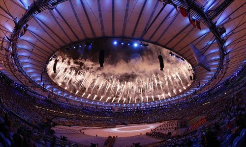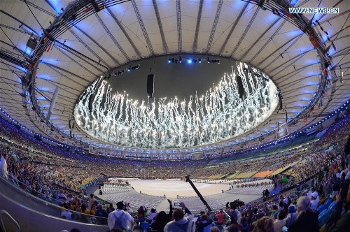 Fireworks explode over the Maracana Stadium during the closing ceremony of the 2016 Rio Olympic Games in Rio de Janeiro, Brazil, Aug. 21, 2016. (Xinhua/Liu Bin)