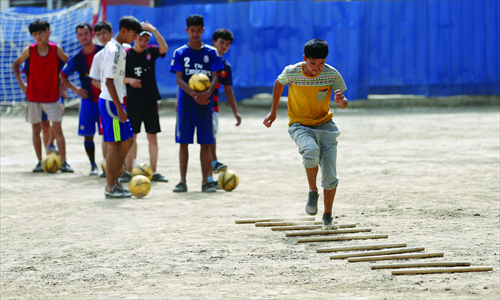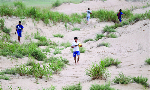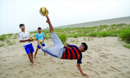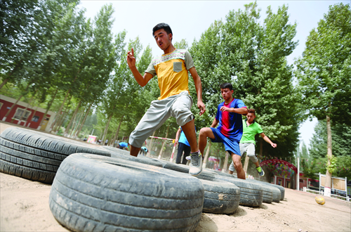 Football players of the Team Hope from Tuohula township train hard on July 12 in Moyu county, Hotan Prefecture, Xinjiang Uyghur Autonomous Region. Photo: Cui Meng/GT