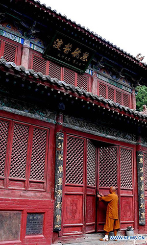 A monk closes the door of Guanyin Pavilion in Fengxue Temple of Ruzhou City in central China's Henan Province, Aug. 30, 2016. Renowned in Ruzhou, the unique Fengxue Temple has a history of over 1,800 years. (Xinhua/Li An)