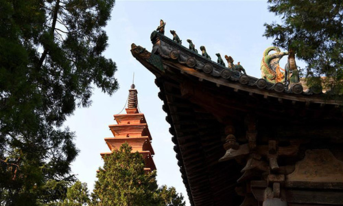 Photo taken on Aug. 30, 2016 shows Qizu Pagoda in Fengxue Temple of Ruzhou City in central China's Henan Province. Renowned in Ruzhou, the unique Fengxue Temple has a history of over 1,800 years. (Xinhua/Li An)