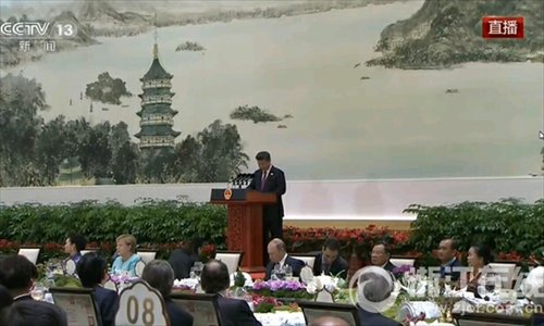 A giant silk painting hangs in the banquet hall of the Xizi Hotel, where the welcome banquet for the G20 summit was held in Hangzhou on September 4. Photo: zjol.com.cn/screenshot of CCTV News