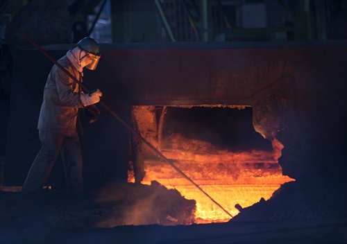 A worker takes samples of molten iron for quality testing from a furnace at the Wuhan Iron and Steel (Group) Corp. Photo: CFP