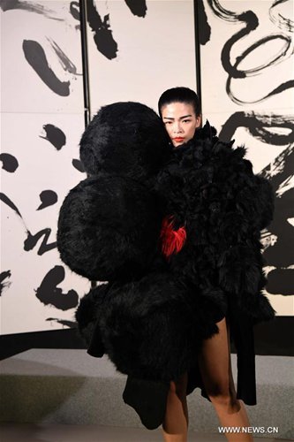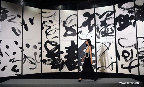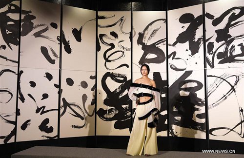 A model presents a creation with Chinese calligraphy elements during a fashion show in Taipei, southeast China's Taiwan, Oct. 12, 2016. (Xinhua/Zhu Xiang)