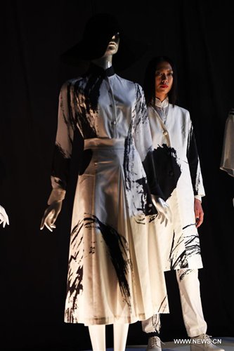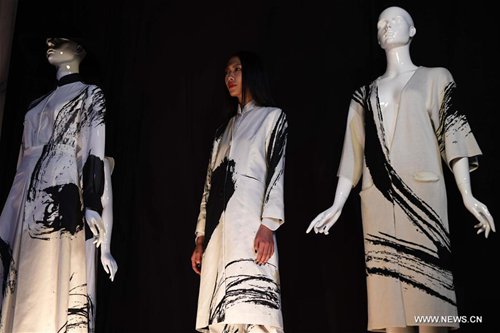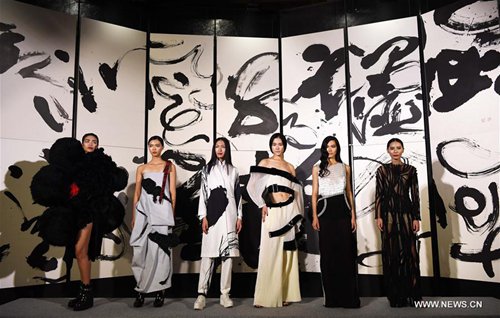 Models present creations with Chinese calligraphy elements during a fashion show in Taipei, southeast China's Taiwan, Oct. 12, 2016. (Xinhua/Zhu Xiang)