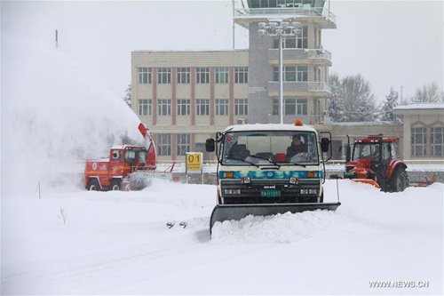 Snow cleaners clear snow in Altay, northwest China's Xinjiang Uygur Autonomous Region, Nov. 16, 2016. The local authority launched a level-four emergency response after the city's snowstorm continued past 50 hours. (Xinhua/Ye Erjiang)