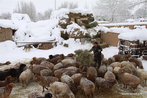 A staff member feeds sheep at a ranch in Altay, northwest China's Xinjiang Uygur Autonomous Region, Nov. 16, 2016. The local authority launched a level-four emergency response after the city's snowstorm continued past 50 hours. (Xinhua)