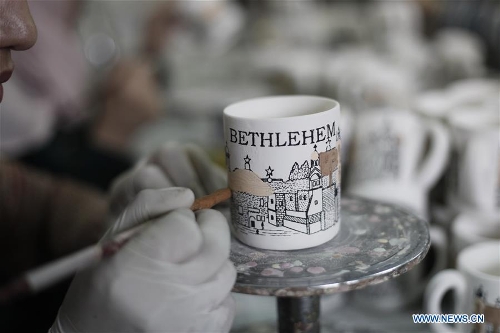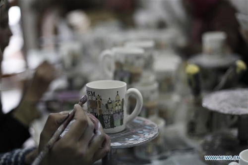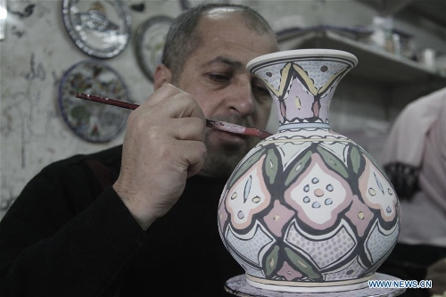 A Palestinian artist paints on a ceramic article at a factory in the West Bank city of Hebron, on Dec. 16, 2016. (Xinhua/Mamoun Wazwaz)