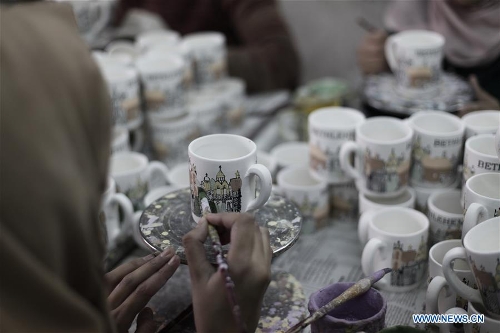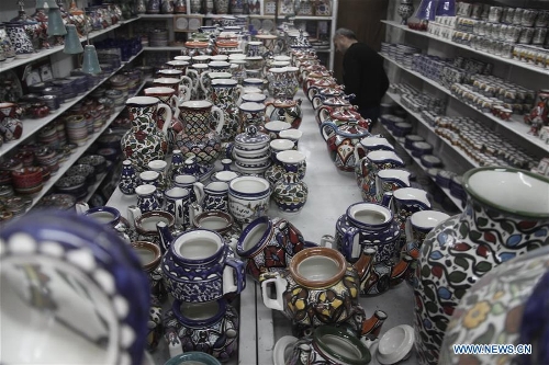 Hand-painted ceramics are displayed at a factory in the West Bank city of Hebron, on Dec. 16, 2016. (Xinhua/Mamoun Wazwaz)