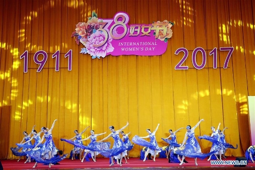 Performers dance during a gathering attended by Chinese women from various circles and foreign diplomats ahead of International Women's Day in Beijing, capital of China, March 7, 2017. (Xinhua/Zhang Yuwei)