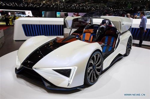 A Techrules Ren concept car of Chinese electric-carmaker Techrules is seen on the second press day of the 87th International Motor Show in Geneva, Switzerland, on March 8, 2017. (Xinhua/Xu Jinquan)
