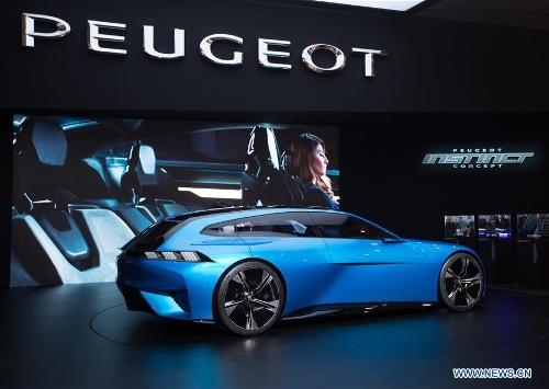 A Peugeot Instinct concept car is seen on the second press day of the 87th International Motor Show in Geneva, Switzerland, on March 8, 2017. (Xinhua/Xu Jinquan)